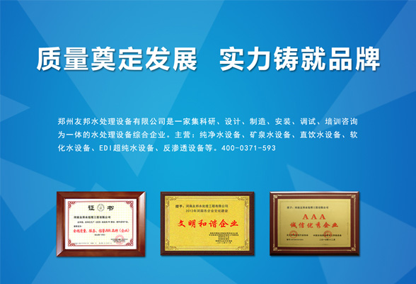 鄭州友邦水處理設(shè)備有限公司始創(chuàng)于2003年。自成立以來,友邦始終堅(jiān)持以“客戶利益為保障”的原則,打造友邦口碑,備受客戶的認(rèn)可和信賴。鄭州友邦是一家專業(yè)從事水處理技術(shù)開發(fā),設(shè)備制造生產(chǎn)及銷售的企業(yè)公司。嚴(yán)格的生產(chǎn)管理系統(tǒng)環(huán)環(huán)相扣,層層把關(guān)。從原材料選購到現(xiàn)場調(diào)試安裝,鄭州友邦重視每個細(xì)節(jié)。公司以堅(jiān)持技術(shù)創(chuàng)新、質(zhì)量創(chuàng)優(yōu)、服務(wù)創(chuàng)佳的原則,以優(yōu)質(zhì)的產(chǎn)品和專業(yè)的服務(wù)實(shí)現(xiàn)我們的承諾:把您擁有的水變成您需要的水!